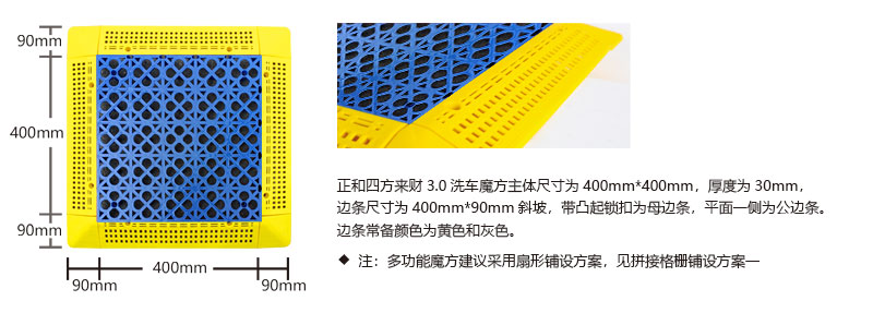 1. 分為3.4.5.厚度,解決不同厚度,統(tǒng)一紋路的問(wèn)題 2. 啞光平紋設(shè)計(jì),防滑,美觀,易清潔 3. 選用高級(jí)原料,加入其他輔料,顏色亮麗,無(wú)異味,無(wú)污染 4. 顏色為紅黃藍(lán)綠黑灰六色,滿(mǎn)足客戶(hù)用色需求,搭配屬于自己的風(fēng)格 5. 通扣鎖扣設(shè)計(jì),容易鋪設(shè)且容易拆卸打理 6. 加強(qiáng)支撐,不容易出現(xiàn)壓壞壓斷現(xiàn)象,滿(mǎn)足大多數(shù)車(chē)輛施工的要求 7. 使用年限長(zhǎng),五年超長(zhǎng)質(zhì)保,使用無(wú)后顧之憂(yōu) 8. 十字支撐,保證承載最大化的同時(shí),且易排泥排水