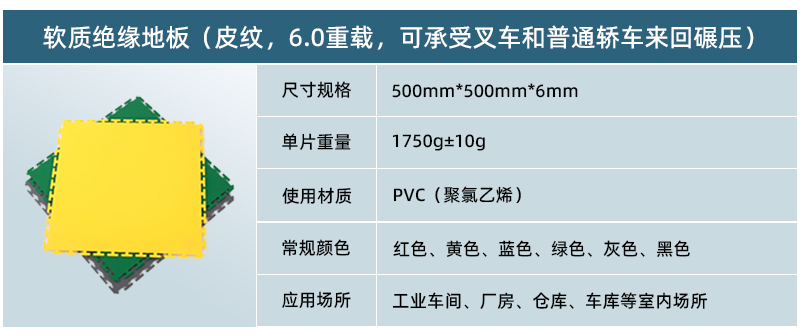 5、高承載,更防滑: 軟質(zhì)絕緣地板為實(shí)心結(jié)構(gòu),只要地面承重沒(méi)有問(wèn)題,其承載能力能夠達(dá)到每平米10噸以上。地板表面在生產(chǎn)過(guò)程中帶有凸起的紋路,讓車(chē)間地面更為防滑。